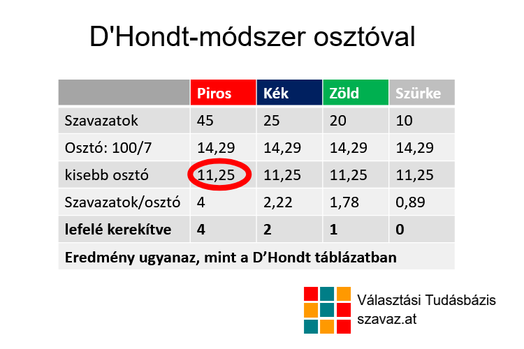 A példában így az osztót (14,29) egészen 11,25-ig kell levinni, hogy a lefelé kerekítéssel 7 mandátumot oszthassunk ki (pl. 11,26 esetén még csak 6-ot osztanánk ki). Ez a 11,25 onnan lehet ismerős (az első és harmadik képen piros körökkel jelölve), hogy pont ez a 7. legnagyobb szám, amivel a D’Hondt táblázatban az utolsó mandátumot megtaláltuk! Ezért ekvivalens a két módszer. Az eredeti 14,29-es osztót nem látjuk a táblázatban, de tudjuk, hogy ennél az értéknél a kerekítéssel 5 mandátumot tudunk csak kiosztani, és lám, a táblázatban is 5 ennél nagyobb (vagy egyenlő) szám van. A 6. mandátumot akkor osztjuk ki, amikor (a nagyobb számok felől jövet) elérjük a 12,5-et, ezt a mandátumot a táblázatunk szerint a kék kapta, és természetesen, ez a 6. legnagyobb szám.