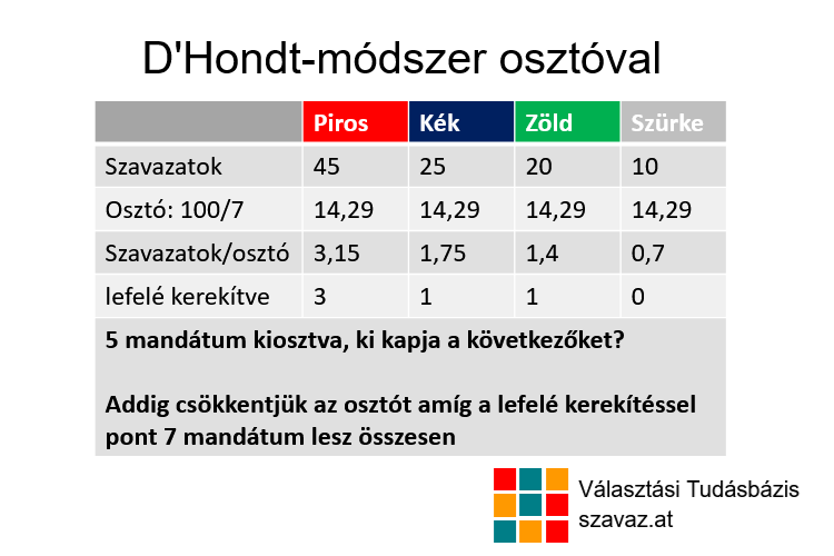 A D’Hondt módszert megfogalmazhatjuk úgy is, hogy minden párt szavazatait ugyanazzal az osztóval leosztva akarjuk megtalálni, hogy mennyi mandátumot szerezzenek. Logikus lenne, hogy ez az osztó az összes szavazat és az összes mandátum hányadosa legyen, vagyis a példában 100/7 = 14,29. De ha ezzel leosztjuk a szavazatokat, nem kerek számokat kapunk. A D’Hondt módszerben (más osztó módszerektől eltérően) mindig lefele kerekítünk. Ha így ki tudjuk osztani az összes mandátumot, akkor ezzel vége is a folyamatnak. De mi van, mint például itt, hogyha a lefelé kerekítéssel nem osztottuk ki az összes mandátumot? A válasz a D’Hondt módszer szerint, hogy az osztót addig csökkentjük, amíg ezzel a lefelé kerekítéssel pont a tervezett mandátumszámot ki tudjuk osztani.
