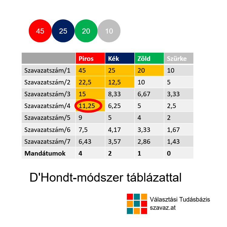 A példában 100 szavazat 4 párt között oszlik meg. Ha 7 mandátumot akarunk kiosztani (emiatt azt is tudjuk, hogy max. 7 sorra lesz szükségünk) a 4 párt között a 7 legnagyobb számot választjuk ki - ez a képen sárgával látszik.